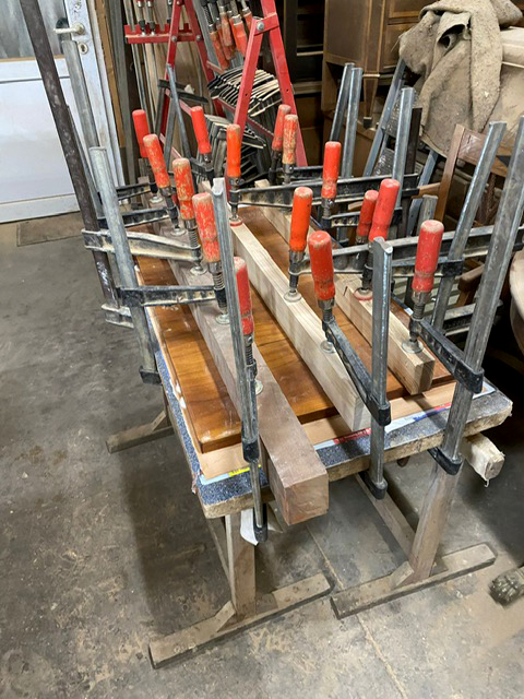 Lose Furniere oder Holzteile werden vorsichtig gelöst und durch Einlagen aus alten Hölzern oder Furnieren möglichst aus der gleichen Epoche ersetzt und mit Knochenleim neu verleimt.